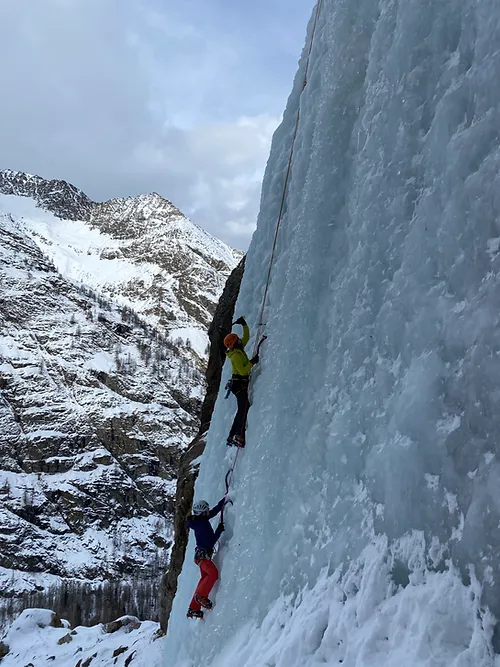 Material específico: aprenderás a manejar piolets, crampones y tornillos de hielo para progresar y protegerte de forma segura en cada paso.